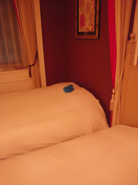 友人ちえぞうが連れてきたピンドラのペンギン2号ぬい。ホテルのベッドにほったらかしてたらこんな感じにベッドメイキングされてた。もえ。